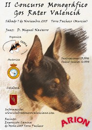 El pasado día 7 de Noviembre de 2015 el Club Español del Ratonero Valenciano - CERVA organizo, dentro del marco de la Exposición Nacional de Torre Pacheco, el II concurso monográfico de nuestra raza. El juez encargado de los juicios fue en esta ocasión D. Miguel Navarro, juez nacional de la RSCE.