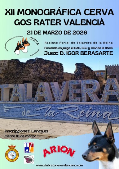 Este año nuestra XII Monográfica del Gos Rater Valencià tendrá lugar en la localidad de Talavera de la Reina, en su Recinto Ferial, dentro del marco de la Exposición Nacional Canina que organiza la Sociedad Canina de Castilla La Mancha a la cual, agradecemos todas sus facilidades y apoyo para la organización de la misma.